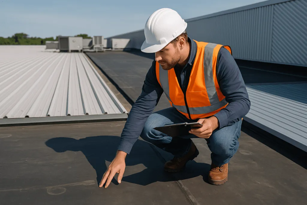 A professional roofing contractor inspecting a large commercial building roof, with a mix of rubber and metal materials visible.