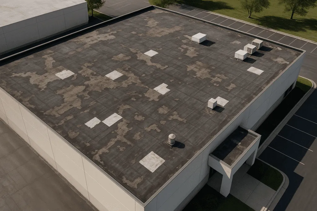 An aerial view of a large commercial building with visible roof damage, including patches and discoloration