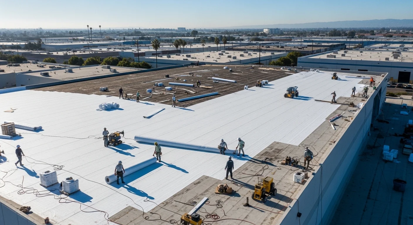 Industrial roofs absorb massive heat. Cool roof systems cut HVAC loads and meet CA Title 24 requirements.