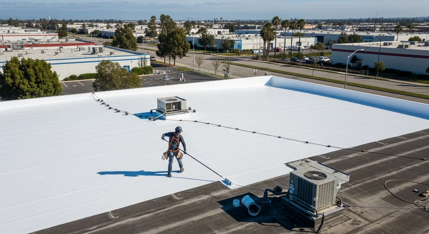 Dark flat roofs absorb heat and drive up AC costs. Cool roof coatings reflect 85%+ of UV rays.