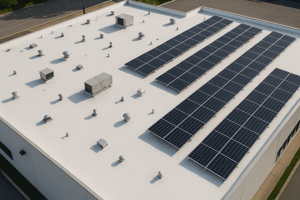 Aerial view of a large commercial building with a flat white roofing membrane, showing ventilation units and solar panels
