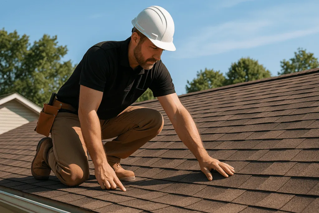 A rooftop view with a professional roofer inspecting shingles for damage on a sunny day